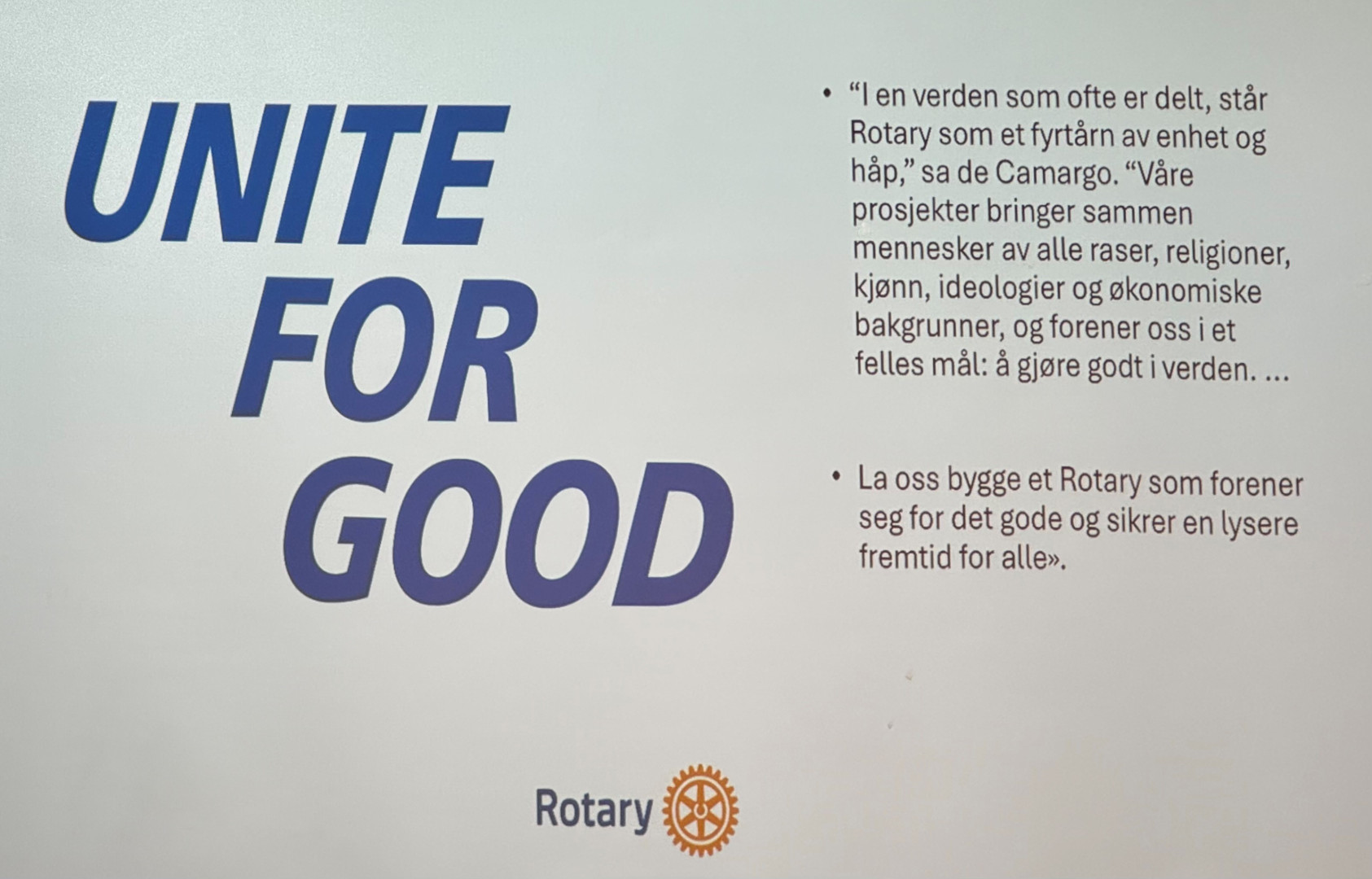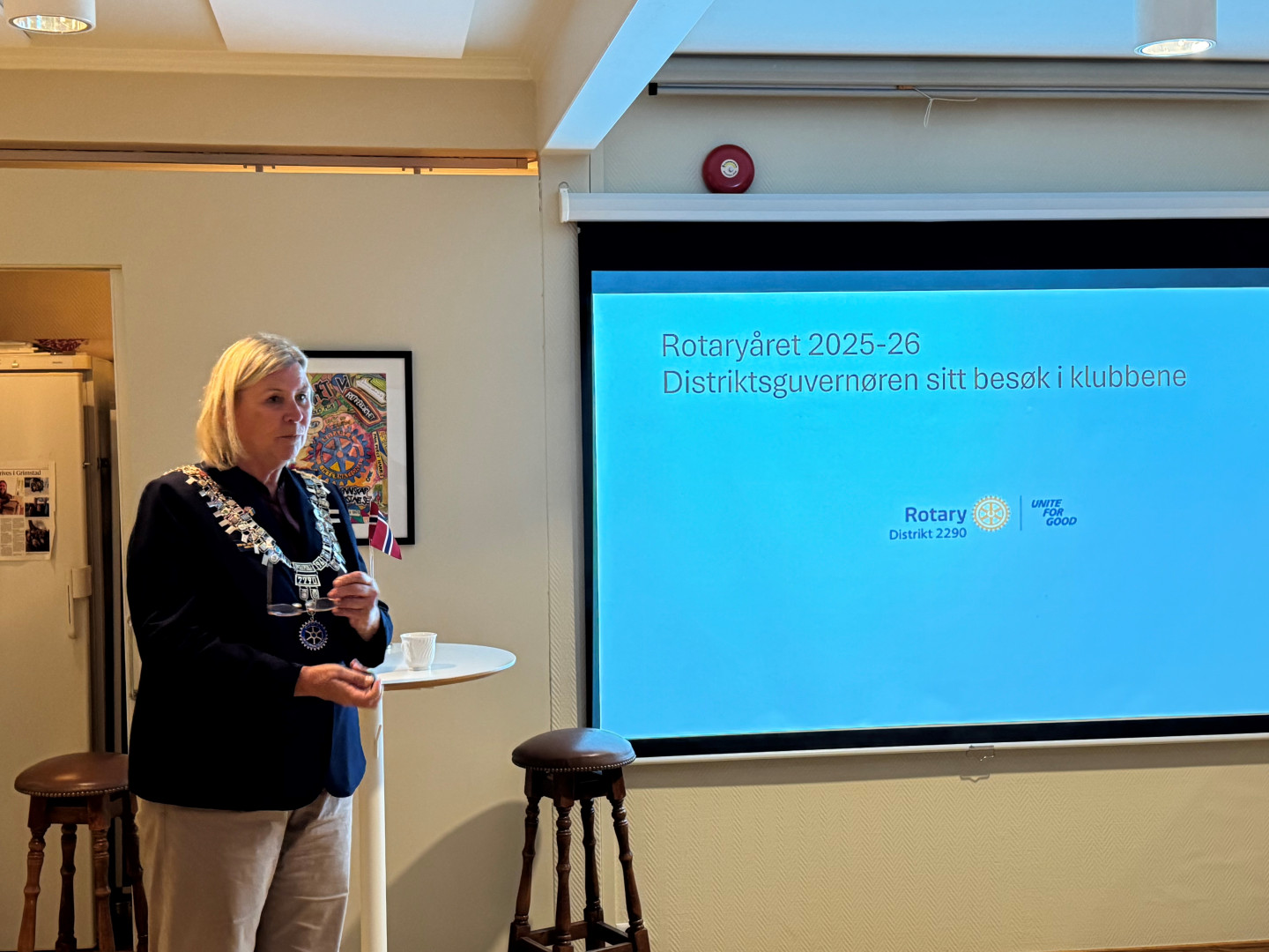 Hyggelig besøk av Distriktsguvernør Astrid Danielsen og Assisterende Distriktsguvernør Siv Emanuelsen. Klubben fikk presentert årets motto "Unite For Good" og at Rotary er så mye mer enn det man først får inntrykk av.